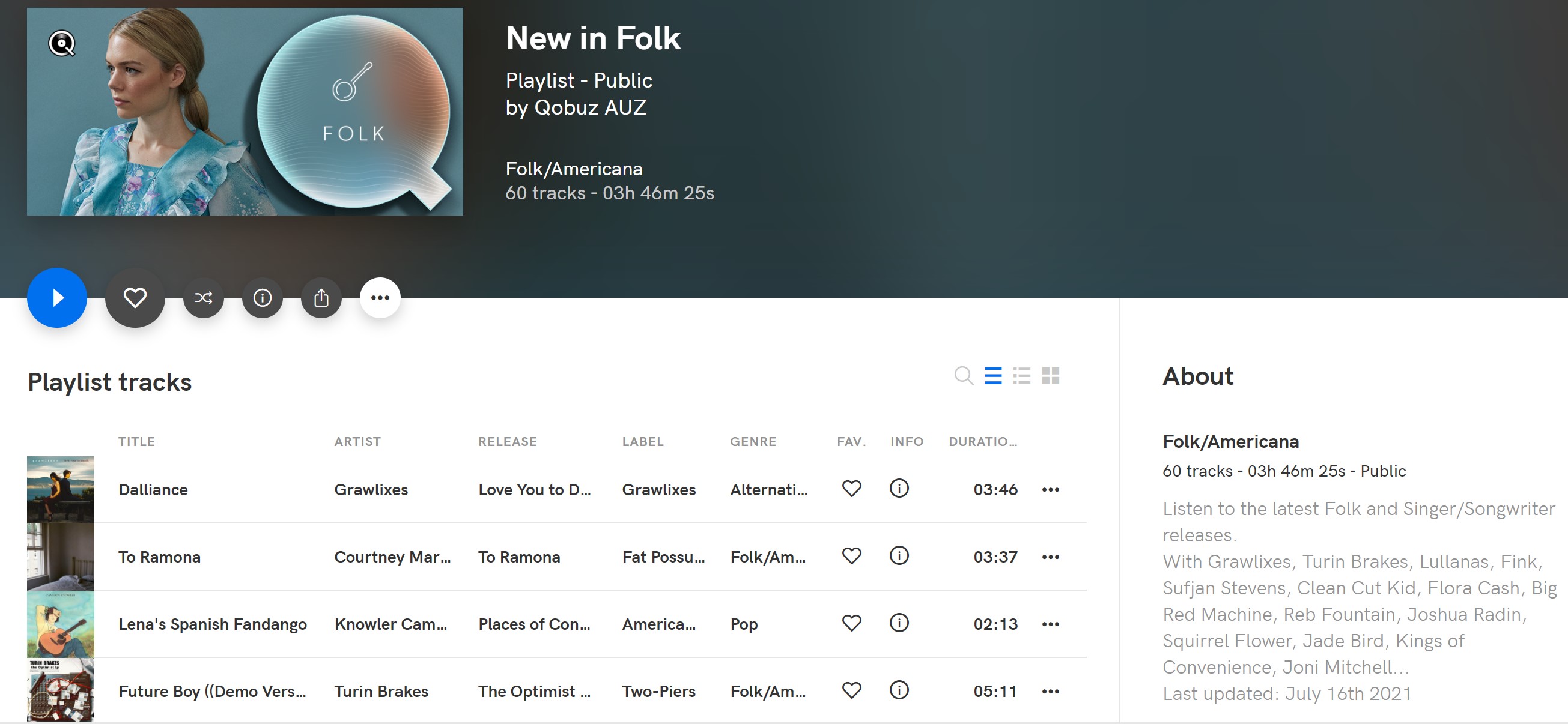 New in Folk (#1 spot, ahead of Sufjan Stevens, Fink, Joni Mitchell, Kings of Convenience- KOC, & David Gray…?!): https://play.qobuz.com/playlist/4325685